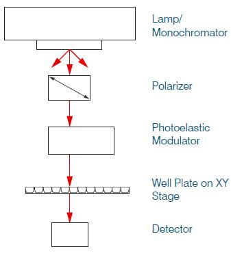 這項圓二色CD技術的突破是通過將一般圓二色CD光譜儀的光路配置進行轉換完成的。在傳統CD(臥式)中,光路的配置使得光束水平穿過裝滿溶液的比色池。通過將光路垂直配置,CD Microplate ReaderTM圓二色譜微孔板檢測儀/酶標儀可以直接測試孔板中的樣品溶液。通過XY運動臺進而可以移動孔板測試所有孔的樣品。