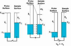 掃描卡爾文探針系統(tǒng)SKP370,是一種無接觸,無破壞性的儀器,可以用于測量導(dǎo)電,涂膜,或半導(dǎo)體材料,與樣品探針之間的功函差。這種技術(shù)是用一個(gè)振動(dòng)電容探針來工作的,通過調(diào)節(jié)一個(gè)外加的前級電壓測量樣品表面和掃描探針的參比針尖之間的功函差。功函和表面狀況相關(guān)。SKP的獨(dú)特性質(zhì)使在潮濕環(huán)境甚至是氣態(tài)環(huán)境中也可以測量,將不可能研究變?yōu)楝F(xiàn)實(shí)。
