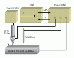 電解液微滴系統(tǒng)可以限定液體與樣品的接觸面,從而對于液滴與樣品直接接觸面內(nèi)的電化學(xué)和腐蝕反應(yīng)進(jìn)行測量。這樣就可以在空間分辨率上提供電化學(xué)活性,并使其限定在樣品特定量化表面。