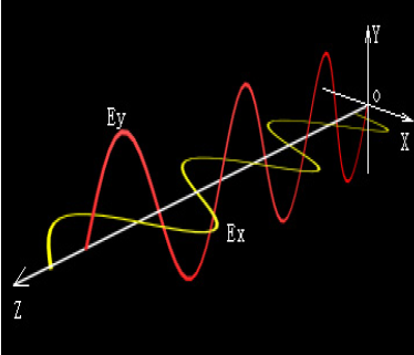 2、圓偏振光:對著光前進的方向觀察時,一束光波的電場矢量(或磁場矢量)端點在空間的軌跡是以光傳播方向為軸的圓形螺旋(在平面上的投影為圓形)。電矢量方向沿逆時針方向旋轉,稱為左圓偏振光;電矢量方向沿順時針方向旋轉,稱為右圓偏振光。