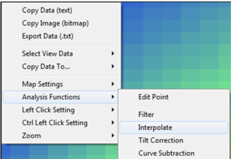 由于形貌測量點(diǎn)數(shù)與最終測量的差異,可以通過差值法使樣品形貌測試結(jié)果的點(diǎn)數(shù)符合最終測量的點(diǎn)數(shù)??梢酝ㄟ^在形貌測試圖上右鍵,選擇“Analysis Functions”來實(shí)現(xiàn),如圖2所示。當(dāng)形貌圖通過插值法獲得理想點(diǎn)數(shù)后,可用于SECM的高度追蹤測試中,如圖3所示。