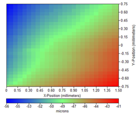 圖5為原始形貌圖和差值處理后的形貌圖??梢钥闯鰳悠吩?.5mm范圍內(nèi)傾斜約15?m。SECM中探針到樣品的距離直接與導(dǎo)體上測試的電流成正比,與絕緣體上測得的電流成反比。如果不校正傾斜,電流測量會受影響。雖然這種影響可以在測量結(jié)束后通過掃描電化學(xué)工作站M470軟件的“Tilt Correction”進(jìn)行校正,但是這對于探針到樣品距離改變引起的相反的變化是無效的。