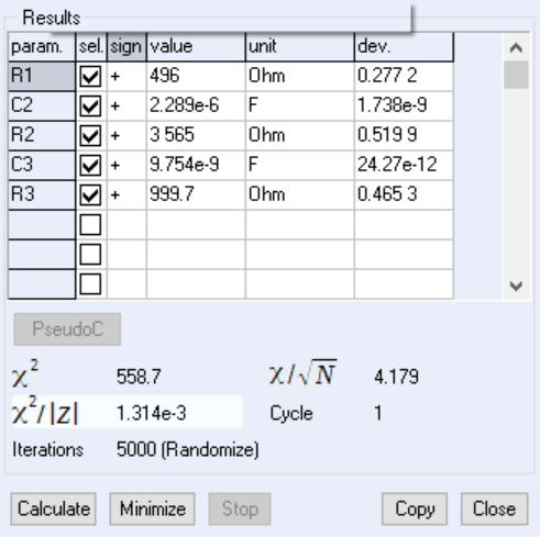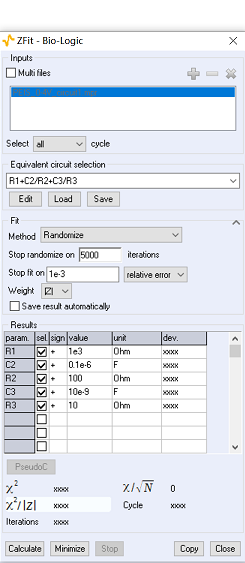 Minimize按鈕則用于計(jì)算每個(gè)數(shù)據(jù)點(diǎn)的阻抗值,并縮小計(jì)算值與實(shí)驗(yàn)值之間的距離。擬合過程中可多次點(diǎn)擊,以獲得最小誤差值。