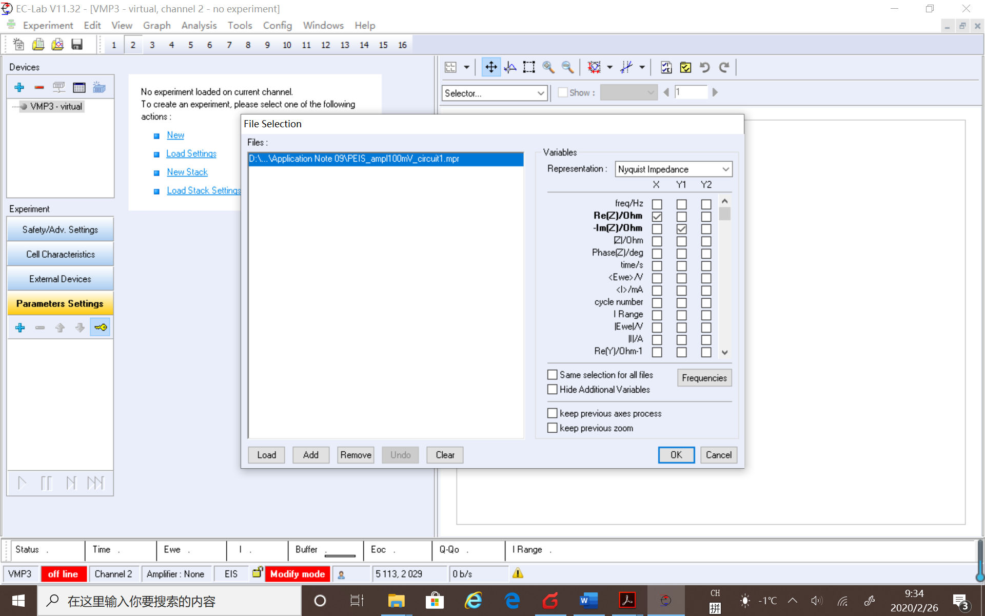 EC-Lab軟件打開EIS數(shù)據(jù)(Experiment→Load Data File...→選擇數(shù)據(jù))或者直接雙擊打開EIS數(shù)據(jù)文件。如下圖選擇X、Y軸數(shù)據(jù)類型。