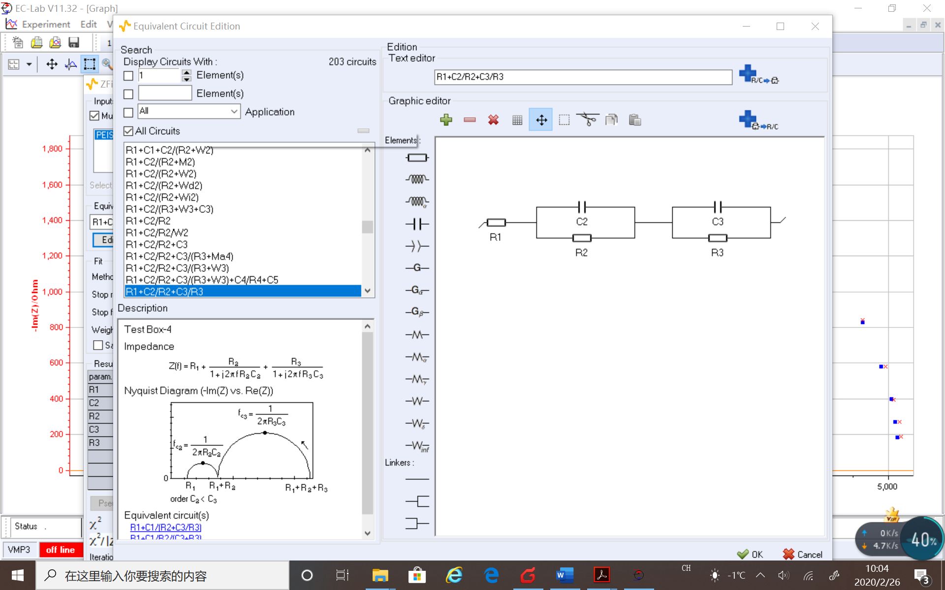 Equivalent circuit selection部分用來選擇擬合電路,其下拉菜單中有軟件預(yù)存的很多電路模型(以EC-Lab v11.32版本為例,約有200多種預(yù)存電路模型)。