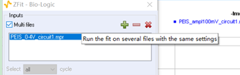 Inputs部分用來確定擬合數(shù)據(jù),如果導(dǎo)入的EIS數(shù)據(jù)包含若干cycle數(shù)據(jù),那可以在這一部分選擇需要擬合的數(shù)據(jù)圈數(shù)。如果要用同樣的設(shè)置來擬合多個(gè)EIS數(shù)據(jù),那么可以通過“+”選擇其他EIS數(shù)據(jù)文件,如下圖。