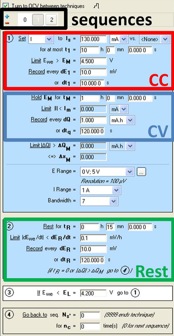 所有的GCPL技術都是CC-CV技術(CC:恒電流;CV:恒電壓)。主要包含三個步驟:(1)CC;(2)CV;(3)rest。
