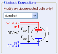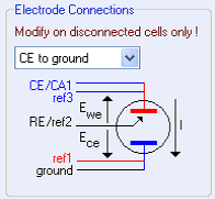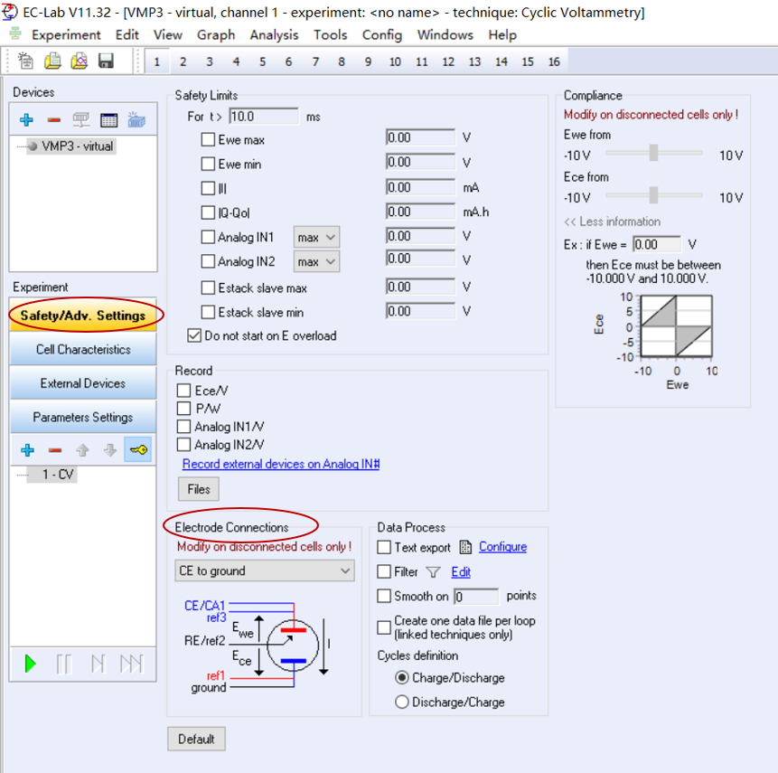 EC-Lab軟件中,添加實驗后,在左側(cè)Safety/Adv. Settings下有一個Electrode Connections部分,其中可以選擇standard、CE to ground或者其他大電流儀器的連接方式(如下圖)。