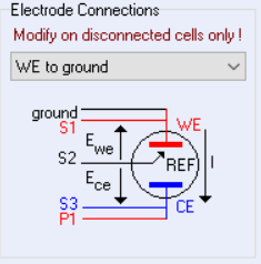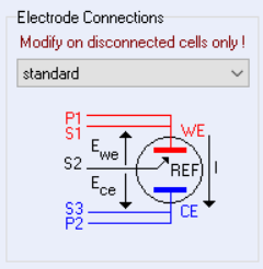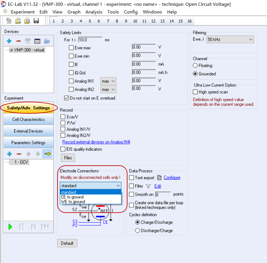 EC-Lab軟件中,添加實驗后,在左側(cè)Safety/Adv. Settings下有一個Electrode Connections部分,其中可以選擇standard、CE to ground、WE to ground或者其他大電流儀器的連接方式(如下圖)。