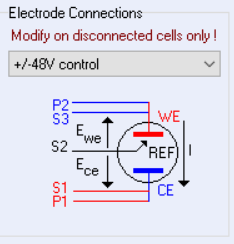 如果VMP300系列電化學(xué)工作站已經(jīng)連接了某個大電流儀器,那么Electrode Connections下面會出現(xiàn)相應(yīng)的特殊的電極連接方式。比如,電化學(xué)工作站連接了1A/48V大電流器,那么Electrode Connections下面會出現(xiàn)“+/-48V control”的選項,如下圖: