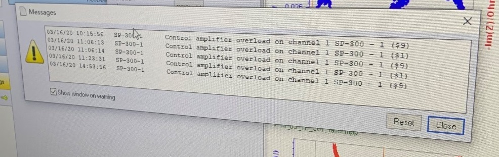 EC-Lab軟件檢測到Ewe、Eoc或者I過載時(shí),都會(huì)彈出報(bào)錯(cuò)信息。下圖就是一個(gè)提示過載的信息。本文主要介紹過載的兩種情況。