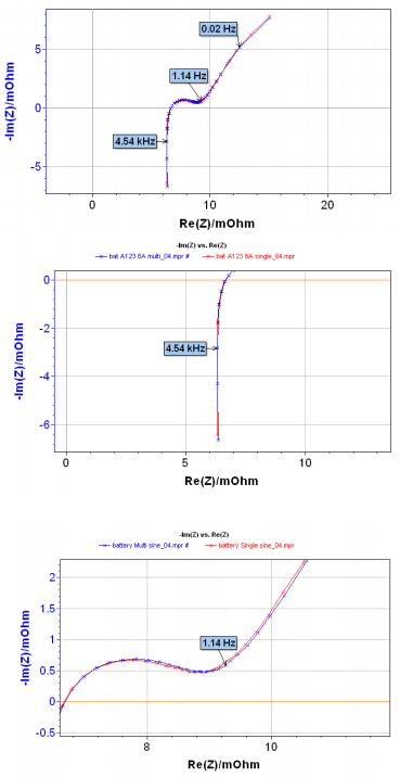 Figure.2 鋰離子電池single sine及multisine eis測量模式對比,紅線為single sine數據曲線,藍線為multisine數據曲線。