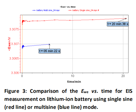 圖Figure.3為鋰離子電池交流阻抗譜圖single sine及multisine測量模式的實驗時間對比。Single sine用時20分38秒,multisine模式則僅用時5分22秒。Multisine測量模式可以明顯的看出比single sine模式快約4倍。Multisine eis測量模式測試非常快速,能大大節省實驗時間,是一個避免某些電化學系統隨時間變化漂移的交流阻抗測量好方法。