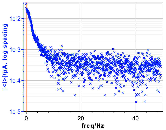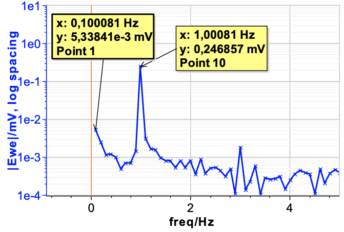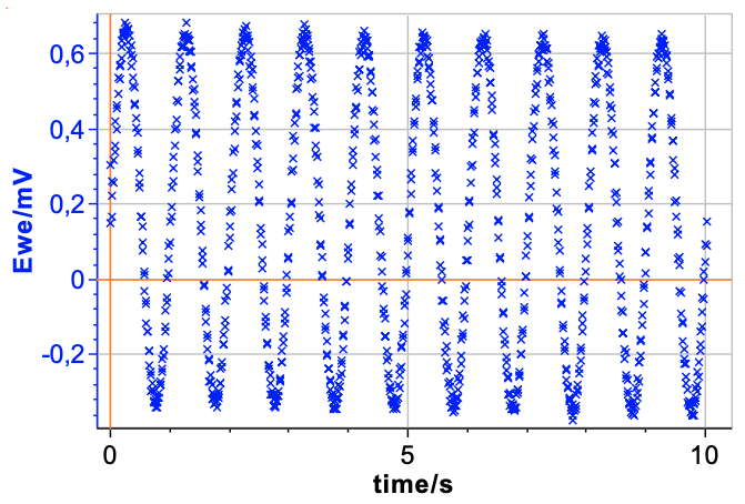 本文使用VSP-300電化學(xué)工作站。對(duì)于程序1,使用超低電流(ULC)選項(xiàng)。電流范圍為1pA,用ZRA技術(shù)記錄ECN,用OCV快速技術(shù)記錄EPN。對(duì)于程序2,不使用ULC選項(xiàng),電流范圍為1μA。使用CASP技術(shù)生成0.5 V振幅(或1 V峰對(duì)峰)的1 Hz正弦波。用ZRA技術(shù)記錄產(chǎn)生的電位。對(duì)于這兩種程序,均使用最小的電位控制范圍,允許1μV的控制分辨率。在測(cè)量的電流和電位上應(yīng)用低通1 kHz模擬濾波器。此模擬濾波器可以在“Advanced Settings”選項(xiàng)卡中選擇。采樣率為100Hz(即每0.01秒一個(gè)點(diǎn))。測(cè)量持續(xù)時(shí)間為300s,這意味著可以觀察到的最低頻率為1/(300)≈3.3mHz(見(jiàn)附錄)。