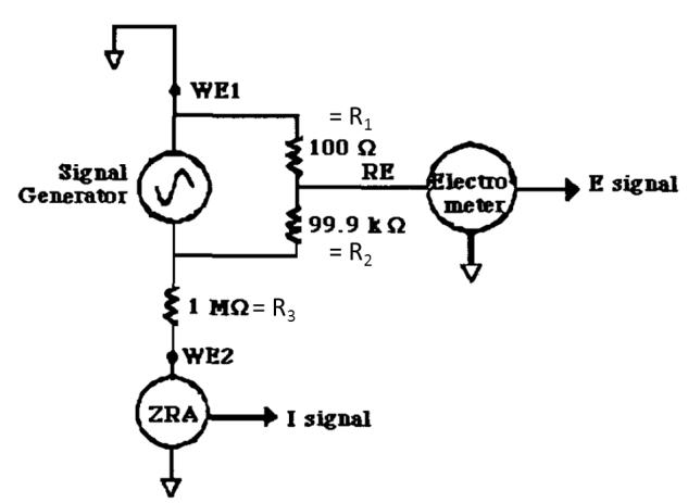 EC-Lab采用ZRA技術(shù)進(jìn)行噪聲測(cè)量。在這項(xiàng)技術(shù)中,恒電位儀在對(duì)電極(CE)和工作電極(WE)之間保持0 V的電位差,并測(cè)量CE和WE之間產(chǎn)生的電流,也測(cè)量CE/WE體系與參比電極之間的電位差。