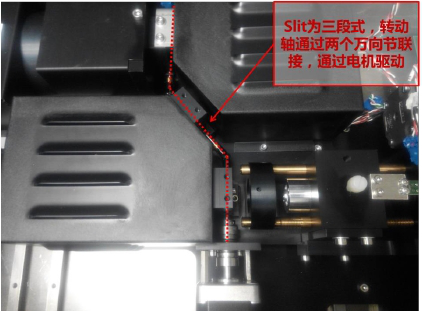 2. 測試前:1)能量測試:no sample,Ex 190 nm,slit 2 nm,autoHV 應小于 350V。否則,波長測試,調整燈位,或燈已老化考慮換燈。4、六個月/12 個月保養涂潤滑油:1)Slit 狹縫:Slit 為狹縫部件,用于調節光譜分辨率。在運動結合部位補加潤滑油,用移液槍配 200ul槍頭,探至各個位置少量添加。有幾個位置點需要卸掉單色器保護蓋后才能接觸到,如圖 2 最右邊的位置。