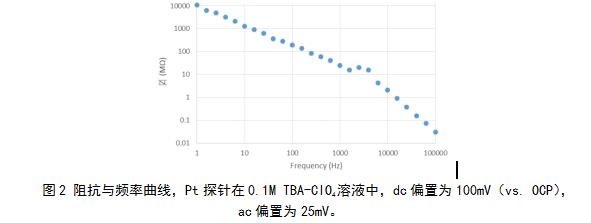 做任何SECM測試之前,探針尖端都需要用頻率掃描實驗表征一下,如圖2所示。施加在探針和對電極之間的dc偏置為100mV(vs. OCP),ac偏置為25mV。