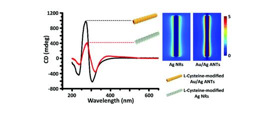貴金屬納米結構與手性分子的耦合在紫外-可見光譜范圍內產生了強烈的手性光學響應。本文通過半胱氨酸與Au/Ag納米管偶聯(lián),制備了半胱氨酸修飾的Au/Ag合金納米管(ANTs)。手性反應強烈依賴于半胱氨酸的手性,表現(xiàn)出明顯的鏡像行為。與Ag-或Au-半胱氨酸手性雜化納米棒相比,半胱氨酸修飾的Au/Ag納米粒子具有更高的手性光學響應。誘導的CD信號出現(xiàn)在Au/Ag ANTs的帶間吸收區(qū)而不是局部表面等離子體子帶,這既可以歸因于Au/Ag螞蟻表面延伸的螺旋網絡構象,也可以歸因于等離子體納米管的近場增強效應。這證實了庫侖相互作用誘導了半胱氨酸與Au/Ag ANTs之間的偶聯(lián),使得半胱氨酸分子在Au/Ag ANTs表面形成一個擴展的螺旋網絡。此外,半胱氨酸修飾的Au/Ag ANTs由于手性活性中心的存在和大基團的空間效應,在催化電化學反應中對氨基酸也表現(xiàn)出良好的手性識別性能。