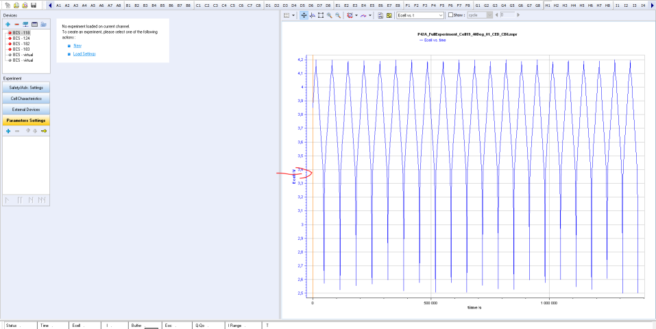 EC-Lab和BT-Lab軟件的另一個特點是當關閉實驗窗口后,不影響數據采集的進行。所以,當發生軟件卡頓時,可以暫時關閉實驗窗口(如下圖所示)。此時由于軟件不需要實時顯示數據,也會相應的減少卡頓。同樣的,當需要顯示頁面時,只需要簡單的雙擊軟件頁面上方的實驗通道序號,即可恢復原來的顯示。