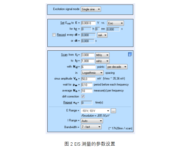 為了在R/C或R+C中選擇合適的等效電路,需要在較寬的頻率范圍(即3 MHz至1 mHz)上進行EIS測量。設置如圖2所示。