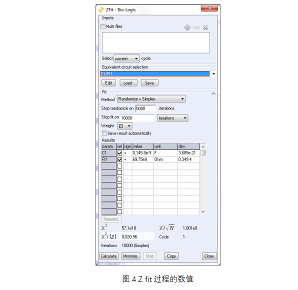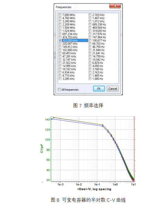 SPEIS7MHz-1Hz允許用戶使用Zfit工具在不同頻率下擬合電容值C1(頻率選擇窗口如圖7所示)。圖8中的C1與實驗中已經計算的Cp值進行了比較。C1和Cp在低電壓下的值約為140 pF,在高電壓下的值約為20 pF。因此,比較表明,用Zfit計算的C1和直接在EIS技術中確定的Cp是相同的。