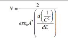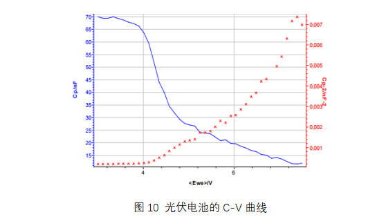 其中e是電子電荷(1.60 x 10-19 C),ε0是半導體介電常數(硅為1.03 x 10-12 F/cm)。A是光伏電池的表面,21 cm2 ,C是電容(F),E是電壓(V)。