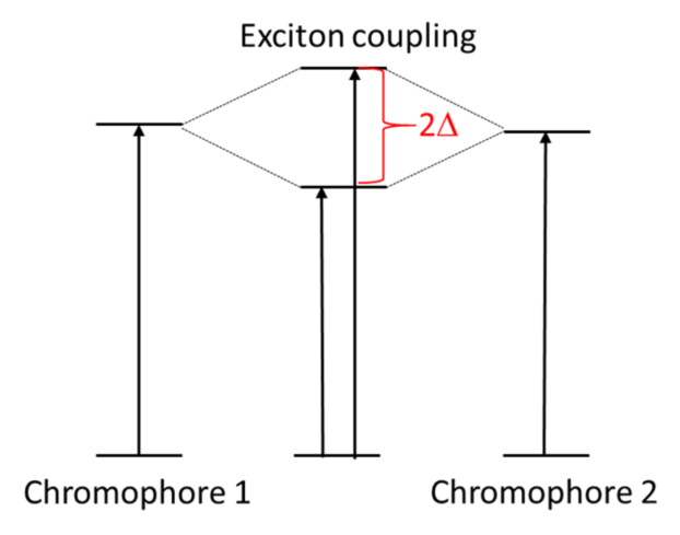 激子耦合圓二色發生于大分子兩個手性生色團之間。當兩個生色團位置合適(距離短、角度合適、環境合適等),它們互相電子轉移產生兩個不同的CD帶,如圖1所示。激子耦合圓二色靈敏度和識別度高,它與給定的空間結構相關,可以獲得復雜結構的絕對構型信息。激子耦合圓二色經常用在高分子、手性有機凝膠和其他手性大分子的可見光區,也可用于蛋白的近紫外區,是傳統遠紫外圓二色譜的補充。