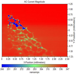 確定了Z軸坐標,就可以進行Si納米管的面掃描了。納米管表面的黑色帶狀區域的面掃描結果如圖3所示。絕對電流值明顯降低的區域為樣品表面的對角區,這與其SEM圖中的單胞結構一致。對角區域和單胞內,電流絕對值都增加。值得注意的是電化學活性可能是形貌和固有電化學性能的共同作用結果。