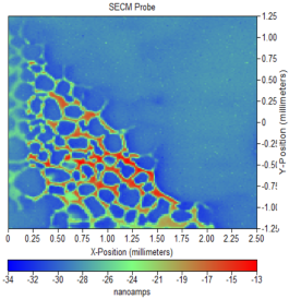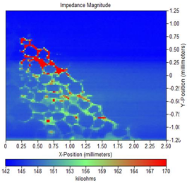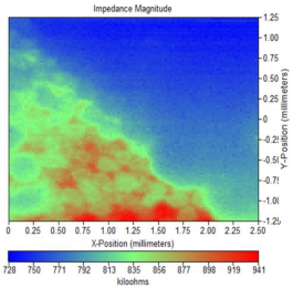 SECM測試也可以在ac模式下進行。與dc-SECM不同,這個技術不需要氧化還原介質或者電解質鹽。這個技術特別有利于測試那些需要避免樣品與環境相互作用的實驗。dc-SECM測試的信號與樣品類型有關。對于絕緣樣品,當探針與樣品的距離減小時,阻抗增大。而對于導電樣品,信號取決于測量頻率和溶液電導率。當測量頻率較低或者溶液電導率較高時,隨著探針到樣品的距離減小,阻抗增大。當測量頻率較高或者溶液電導率較低時,隨著探針到樣品的距離減小,阻抗減小。ac-SECM測試提供了樣品形貌和電化學活性兩種信息。