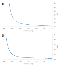 圖2 Si晶片(a)和Si納米管(b)的典型逼近曲線結果。隨著探針與樣品的距離減少,電流降低。