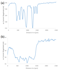 另一方面,自來水中的測試結果顯示了比5 mM [Fe(CN6)3-/[Fe(CN6)]4- / 100 mM KCl溶液中更多的特征。也注意到,dc-SECM測量中,當采用ac-SECM在自來水溶液中測量納米管陣列時,可以看到單胞周圍具有更高的電化學活性,而這種特性在5 mM [Fe(CN6)3-/[Fe(CN6)]4- / 100 mM KCl溶液中同樣的測量中并不明顯。圖6中對比了相似區域的測量的截面。比較發現雖然兩種系統顯示了黑色帶狀區域的活性的相似的改變,在自來水中黑色帶狀區域的空隙和峰值處,活性的改變減小。